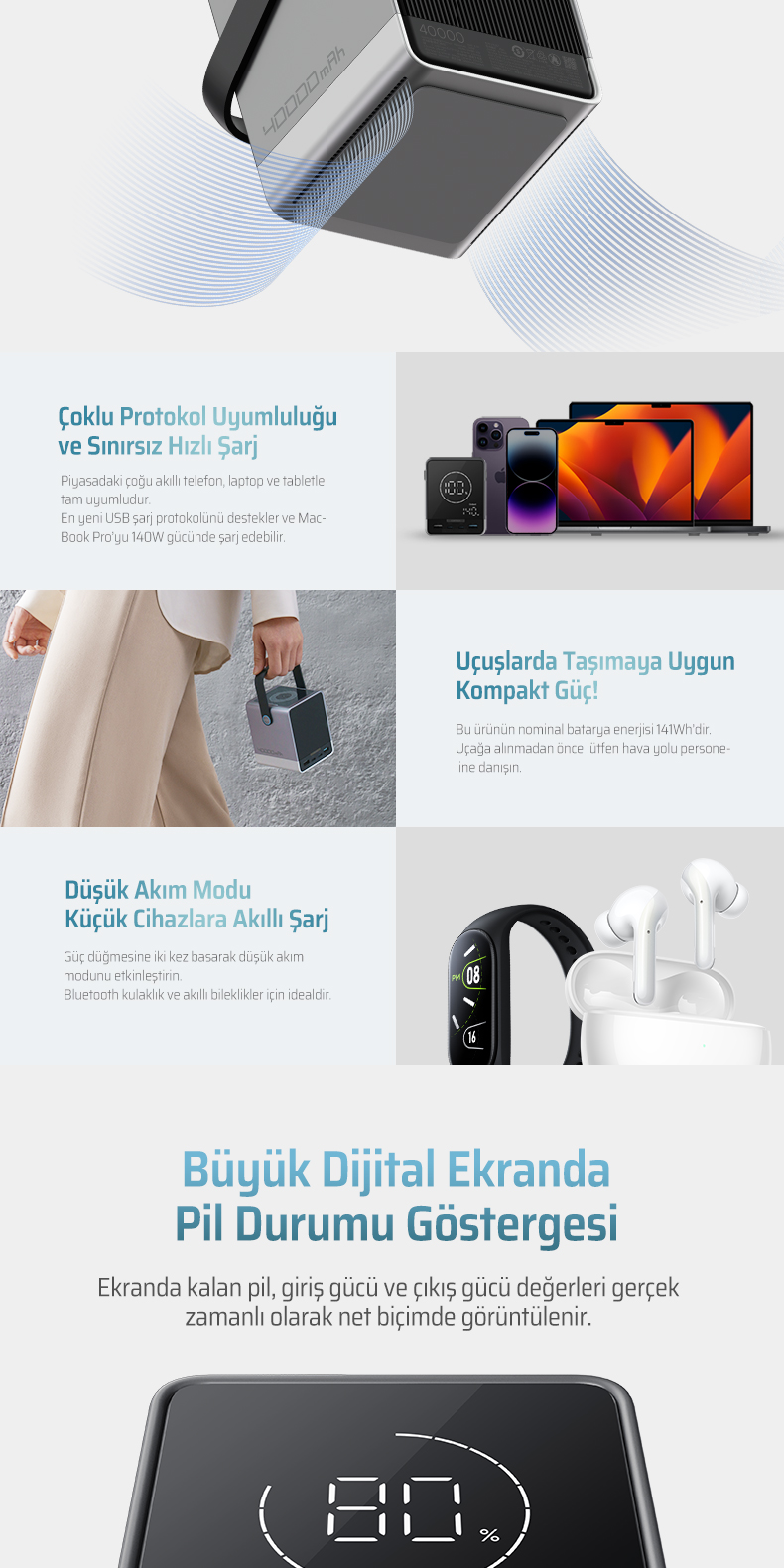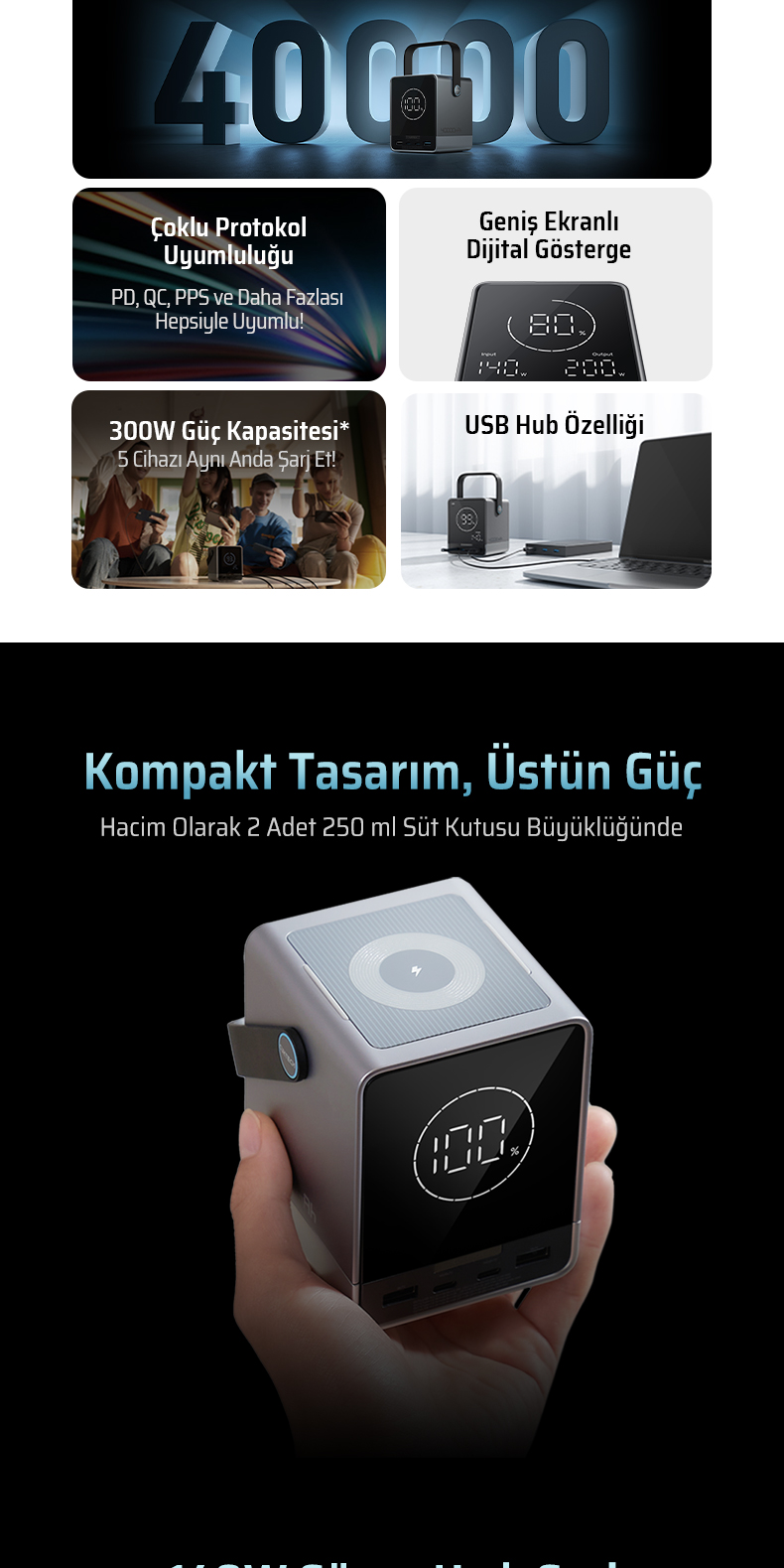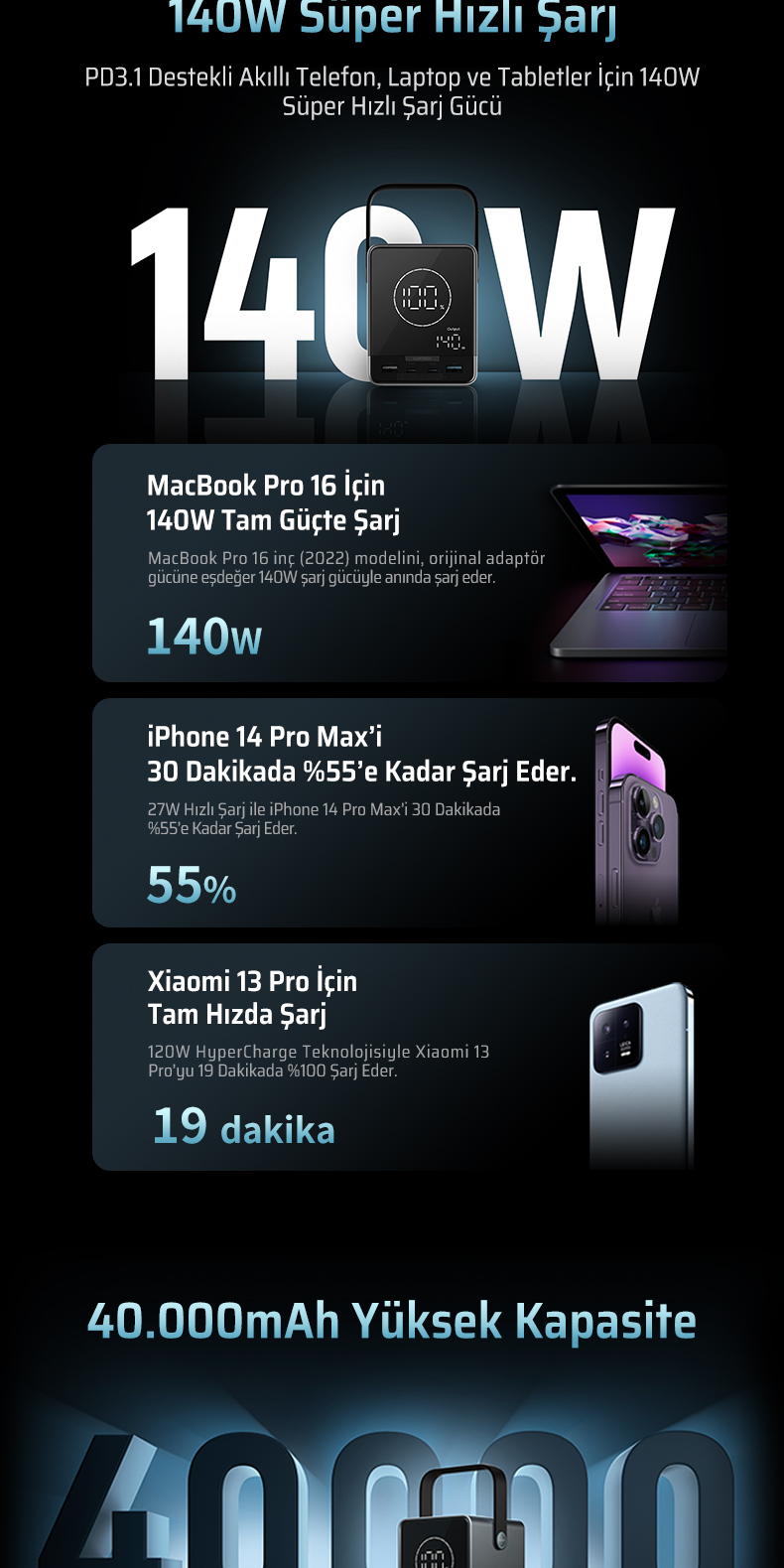 40.000 mAh Yüksek Kapasite – Uzun Süreli Enerji Desteği