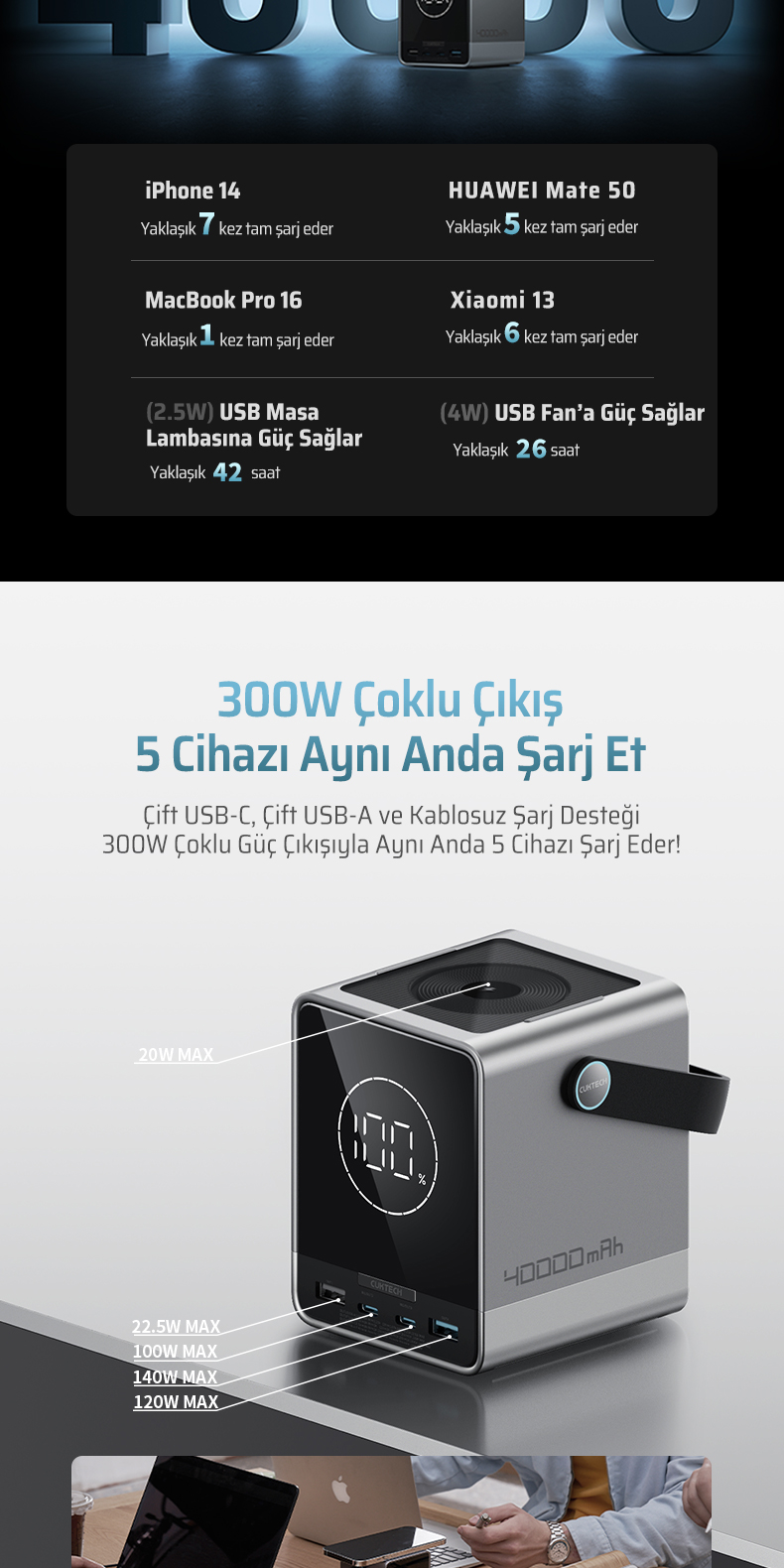 Bir MacBook Air’i iki kez, iPhone 15 Pro Max’i ise sekiz kez tam şarj edebilecek kapasitededir.