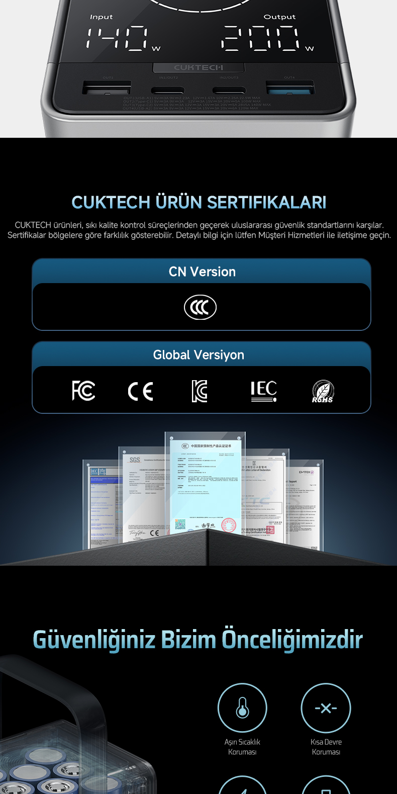 Tüm bileşenler UL, CE, CB ve FCC sertifikalarına sahiptir.