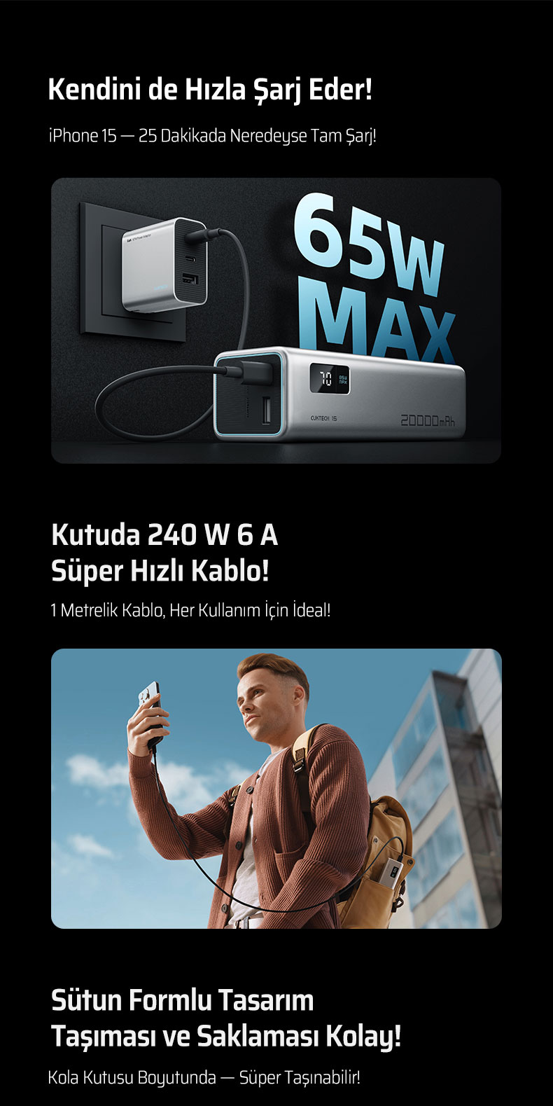 CUKTECH 15 SE Powerbank 20000 mAh | 100 W PD 3.1 Süper Hızlı Şarj | 3 Port (2C1A) | TFT Ekranlı Taşınabilir Şarj Cihazı