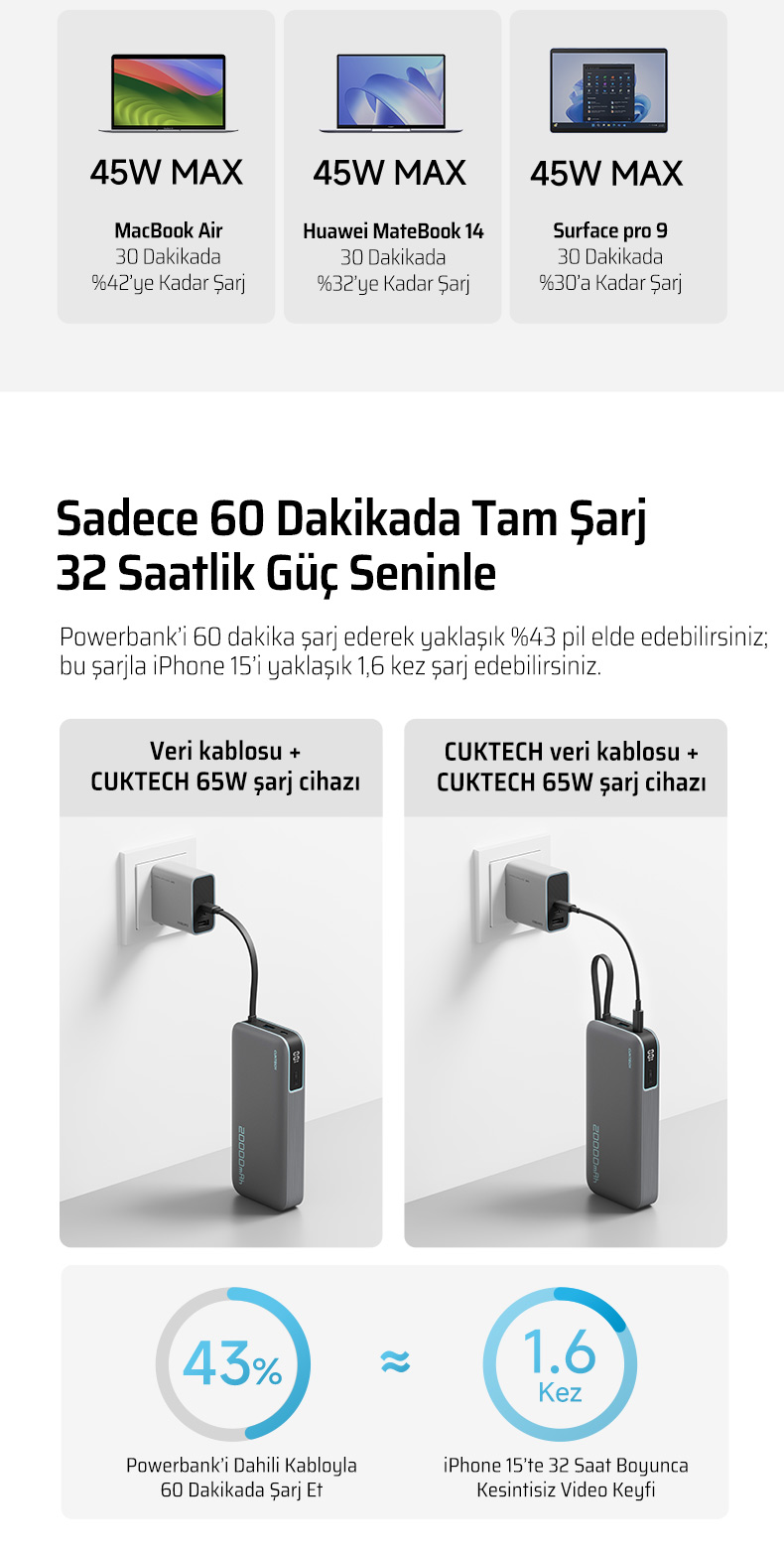 55 W’a kadar PD3.0 hızlı şarj desteği sayesinde laptop, tablet ve akıllı telefonlarınızı güvenle şarj eder.