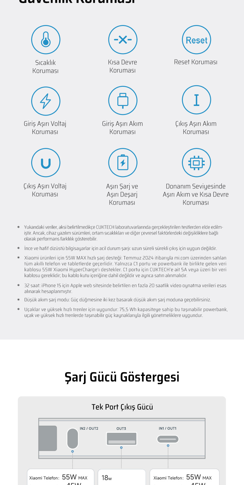 CUKTECH’in çok katmanlı güvenlik sistemi; aşırı ısı, kısa devre, aşırı akım ve voltaj dalgalanmalarına karşı koruma sağlar.