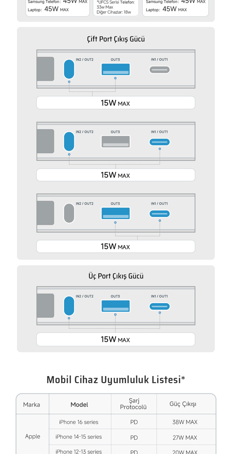 Aynı anda iki cihazı (Type-C + USB-A) şarj etme imkânı sunar.