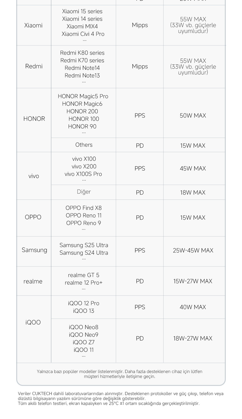 PD, PPS, QC ve FCP protokollerini destekler.