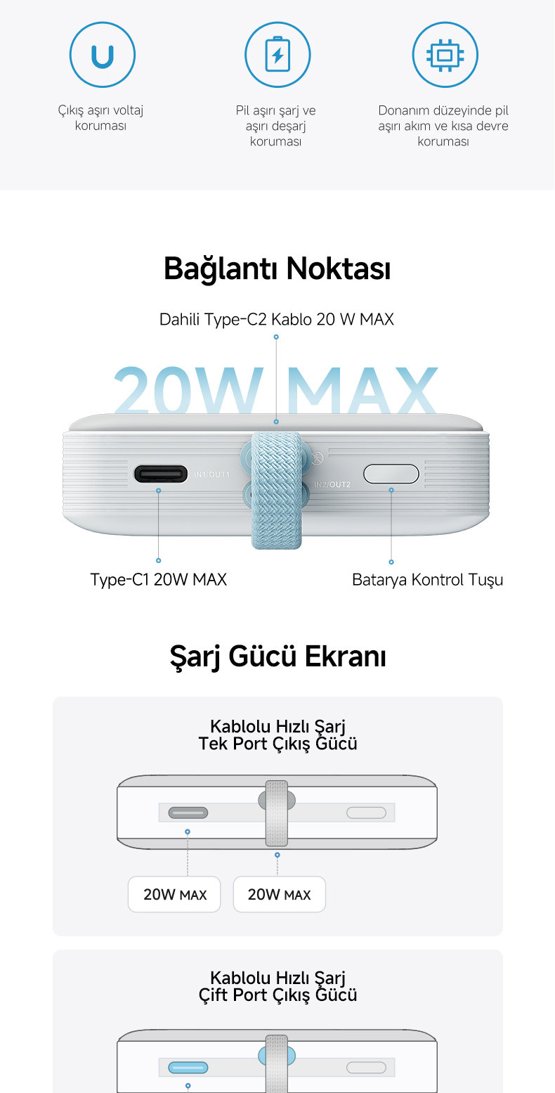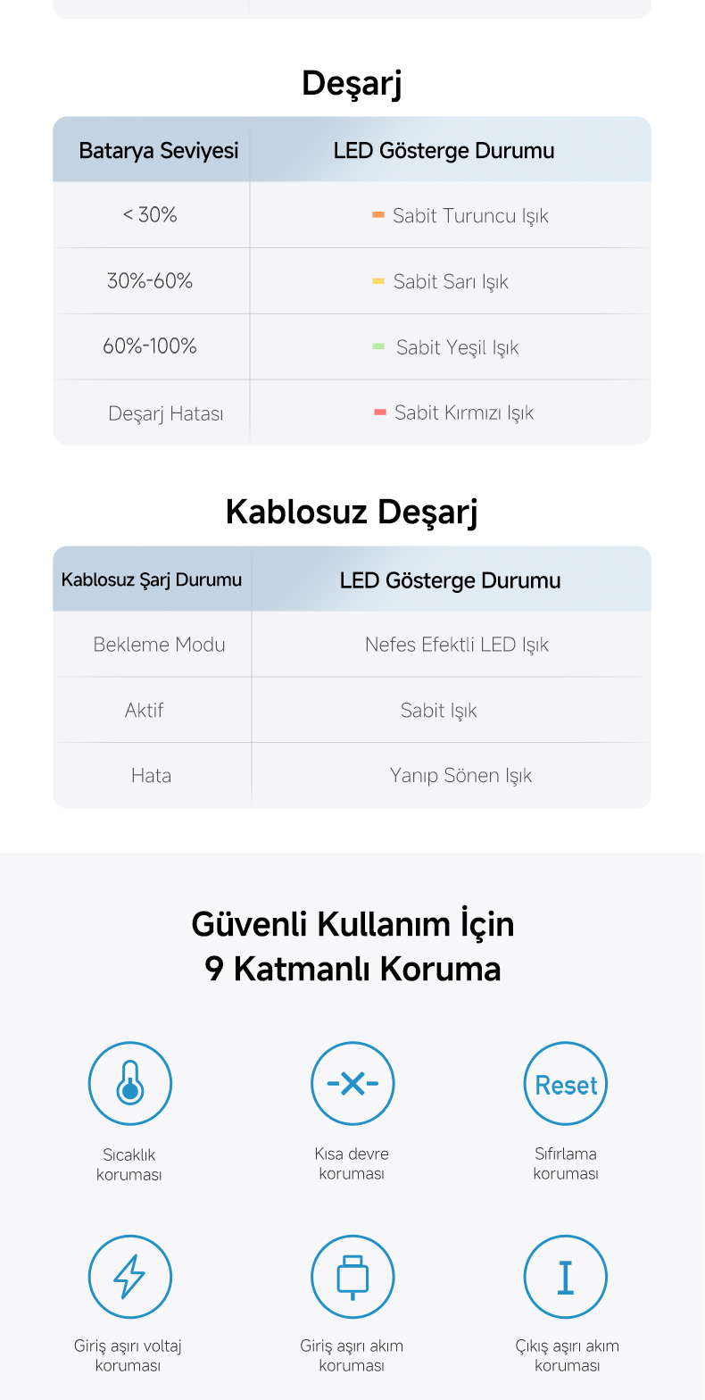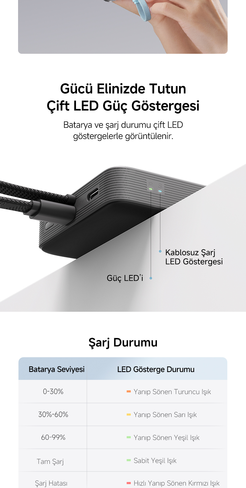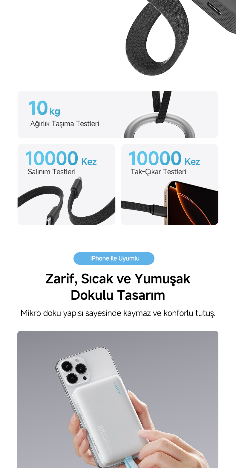 Kabloya ihtiyaç duymadan güvenli ve verimli şarj deneyimi sunarken, 10.000 mAh kapasitesiyle gün boyu enerji sağlar.
