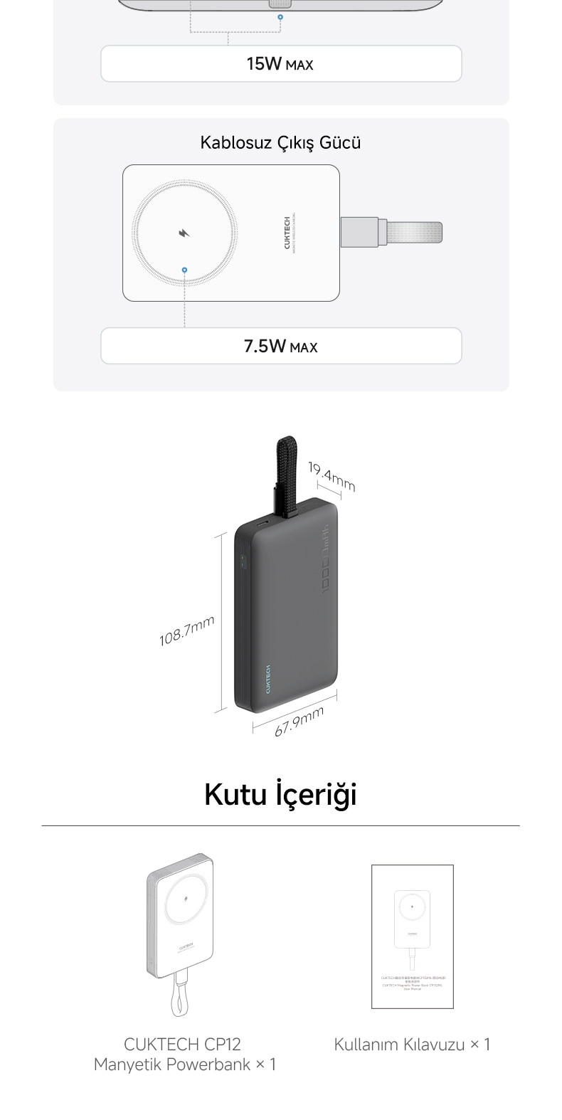 CUKTECH MagSafe Powerbank CP12 10000 mAh | 20 W Kablosuz Hızlı Şarj | iPhone 12/13/14/15/16/17 Serisi ile Uyumlu Taşınabilir Şarj Cihazı